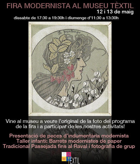 - El 12 i 13 de maig tindrà lloc una nova edició de la Fira Modernista a Terrassa. Com cada any, el nostre Centre hi participa amb diferents activitats per a tothom.Consulteu el nostre programa.